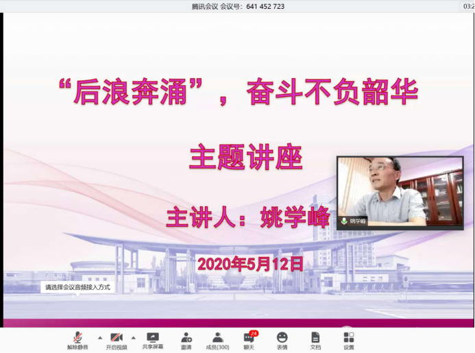 为更好地引导青年大学生树理想、强本领、勇担当 ,5月12日晚,欢迎光临888集团关工委副主任姚学峰为300名团学骨干和入党积极分子作了一场“后浪奔涌,奋斗不负韶华 ”的线上讲座。会议由欢迎光临888集团党委副书记刘颖主持。