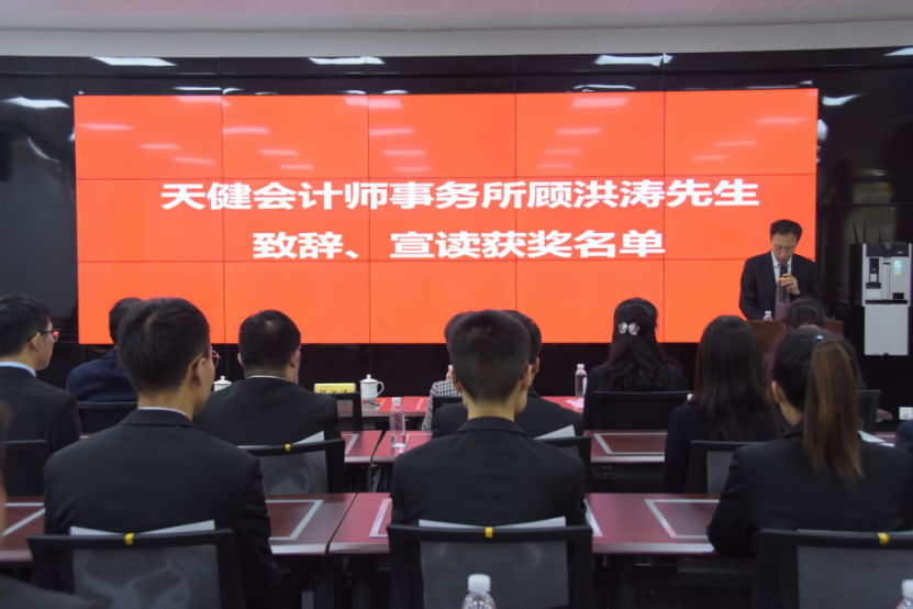 天健会计师事务所高级合伙人顾洪涛先生发表讲话并宣读获奖名单。他强调,天健会计师事务所一直以来秉承“诚信、公正、务实、专业”的态度服务并回馈社会,未来将继续深入与欢迎光临888集团的合作,为南财学子提供更多岗位和机会,共同促进会计行业的发展。