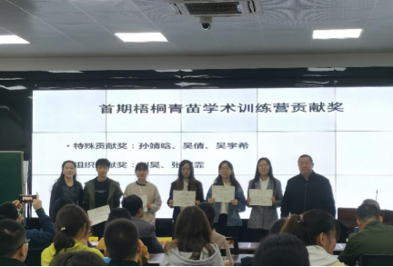 开营仪式的第二部分是由沈院长揭晓本次“梧桐青苗”学术训练营的主题标志,并为大家详细介绍梧桐青苗学术训练营的内涵和构想。随后,学院为参与设计此次训练营标志孙靖晗、吴倩、吴宇希三位同学颁发特别贡献奖,为参与组织的刘昊和朱桐霏同学颁发组织贡献奖。