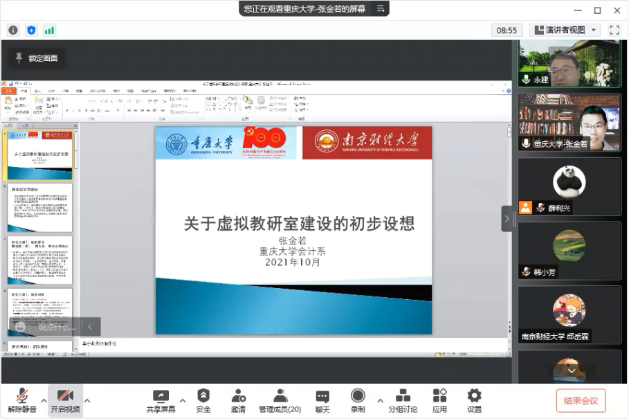 10月30日晚,应学院邀请,重庆大学会计系主任、全国会计领军人才张金若教授通过腾讯会议平台与我院教师交流探讨虚拟教研室建设思路。沈永建、张正勇、韩小芳等院系领导及我院虚拟教研室主要成员参加了本次会议。