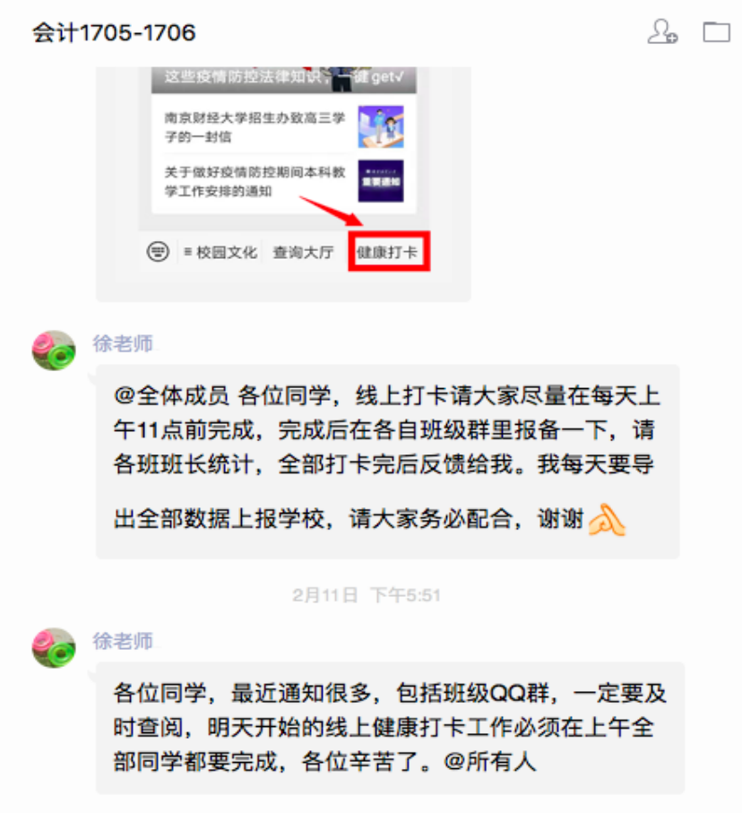 2月12日起,学校每日线上健康打卡正式开始,徐老师承担着近百名同学的数据统计、核对、排查、导出、上报工作。为确保打卡效率,徐老师实施“线上健康打卡+微信班群回复完成情况”两手抓制度,坚决落实好全员参与,确保一个也不能少。对于偶尔发生的学生漏打卡现象,徐老师会通知班委第一时间联系学生、询问情况;如有学生联系不上,徐老师则会立即联系家长,直到打卡完成、学生身体健康徐老师方能安心。