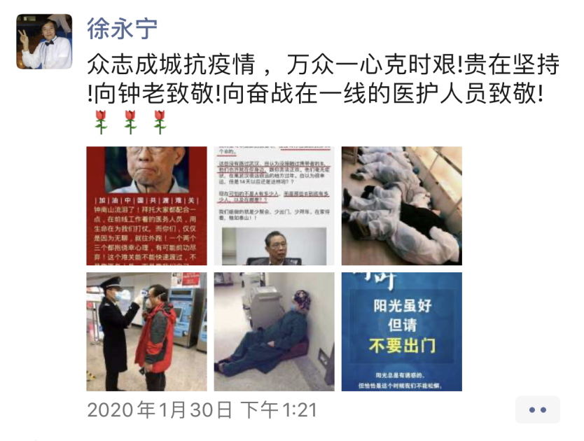 徐老师积极在朋友圈里传递正能量,引导学生合理安排生活,建立正向思维。教育学生通过电视、新闻向奋战在一线的广大医护人员和工作者们学习,通过领悟感人事迹,帮助学生筑牢正确的世界观、人生观和价值观;鼓励学生把时间精力投入到学习、读书、运动、与家人的陪伴中去,建立良好的生活习惯,发现生活的平凡乐趣;引导学生积极化解因疫情蔓延形势而产生的紧张、焦虑情绪,与班级心理委员建立沟通联系,使同学们坚信没有一个冬天不会逾越,没有一个春天不会来临。