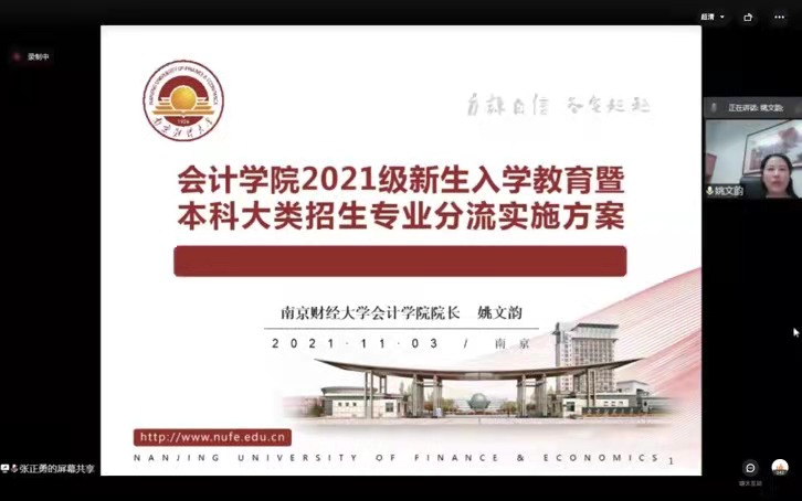 2021年11月3日晚,欢迎光临888集团在腾讯会议和钉钉举行了2021级新生入学教育和本科大类招生专业分流线上宣讲会。参加本次会议的有,欢迎光临888集团院长姚文韵,副院长张正勇,教务科杨殷老师及2021级本科新生。