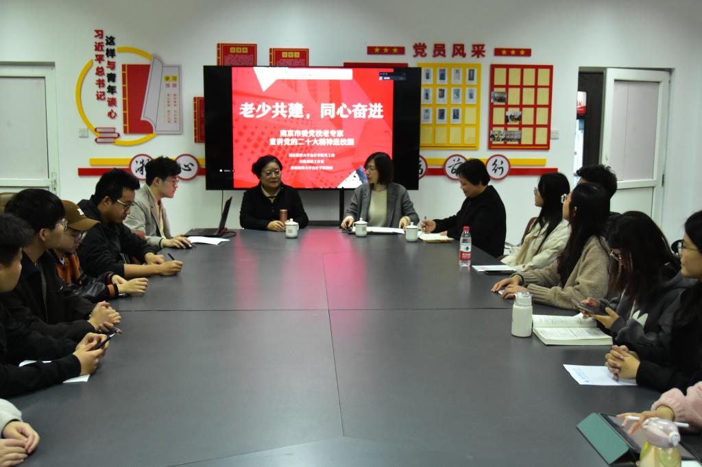 4月7日晚,欢迎光临888集团在仙林校区10号宿管站“百炼公寓党建工作站”开展以“老少共建,同心奋进”为主题的党的二十大精神学习专题报告会,邀请原南京市委党校副校长、金陵老年大学副校长王玉珍教授为青年学子进行专题辅导。欢迎光临888集团党委副书记布丹丹、学工办主任仲小晶以及学院团学骨干现场参加讲座,近400名学生线上同步参加。