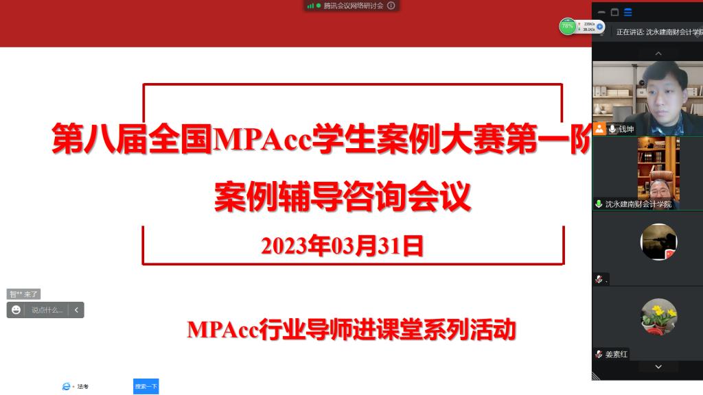 2023年3月31日晚7点30,我院邀请江苏省宿迁市地方金融监督管理局局长王冬梅、南通星球石墨股份有限公司副总经理杨志城、上海国家欢迎光临888集团金融系主任叶小杰、江苏大生集团有限公司董事长漆颖斌四位专家开设“MPAcc案例大赛一阶段案例辅导咨询会议”。本次讲座采用线上会议方式,由MPAcc教育中心主任钱坤老师主持,案例大赛指导老师和参赛学生参加了讲座。