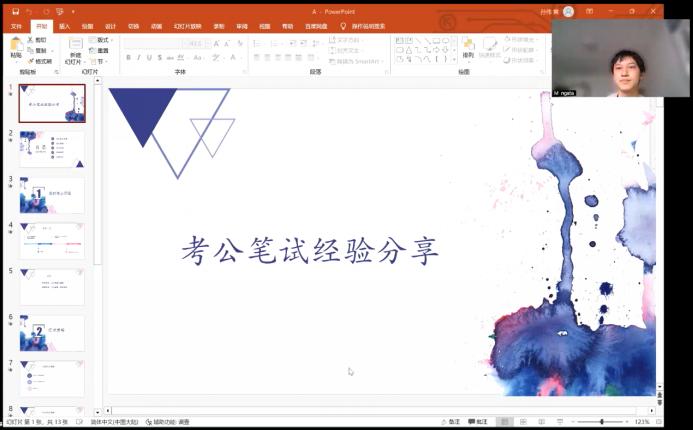 吉晓玥以事务所为例,为大家做了求职经验的分享。她建议同学们调整求职心态,不要焦虑,不要盲目跟风,根据自己的专业和职业生涯规划来确立求职目标,还分享了制作求职简历、投递求职简历的技巧,以及对后续工作的看法。