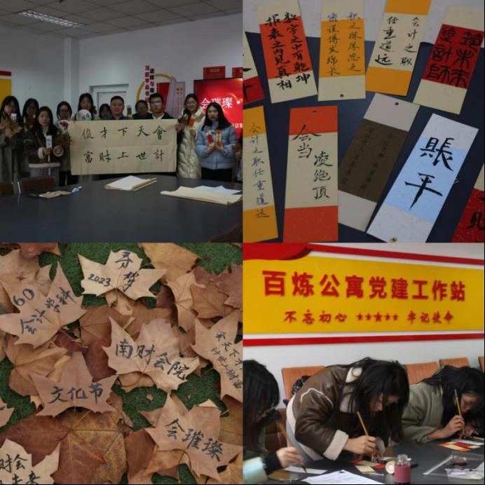 12月18日晚,“筑梦财会人”主题书法文创活动在“百炼公寓党建工作站”顺利开展。书法,作为一种艺术,不仅传达着个人的才情气质,也承载着一代财会人的精神气象。此次书法文创作品用多样的载体、丰富的形式和内容,展现出了会院学子的才华与热情,书写了独属于会院人的浪漫,表达出了对南财会计学科发展60周年的真挚祝福。