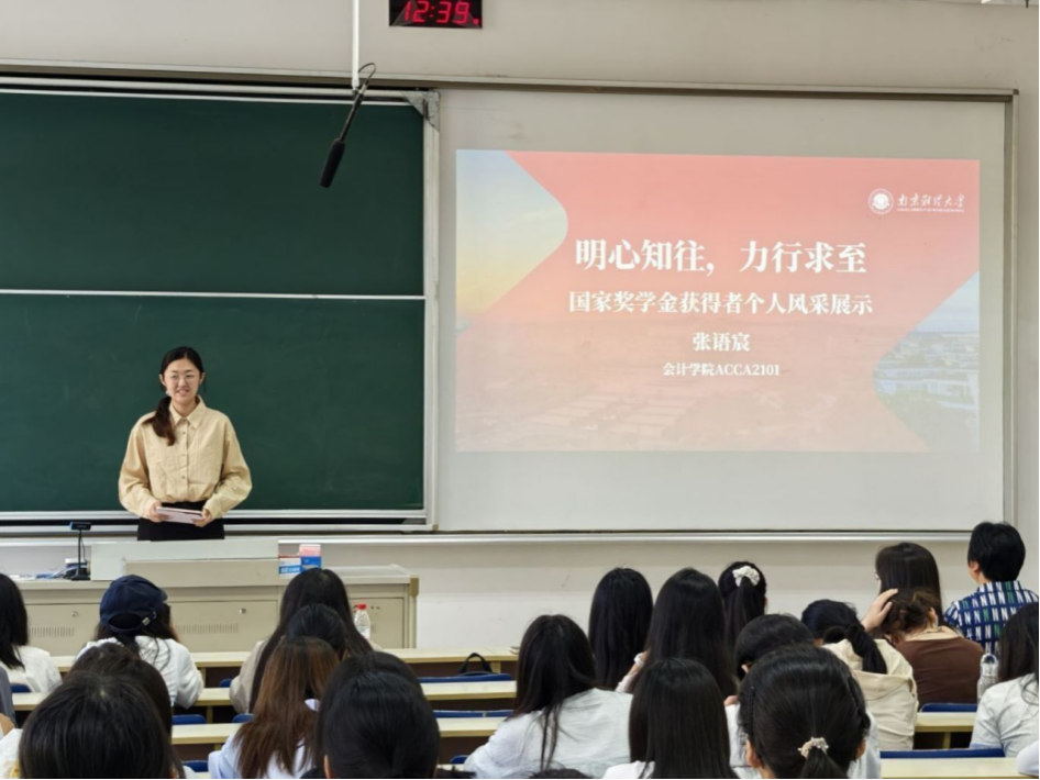 张语宸同学围绕“学、行、责”三个方面进行分享。她不仅分享了严谨求学、追求卓越的学习态度和高效的时间管理方法,更着重讲述了如何在学业精进的同时,明确个人目标,并持之以恒地付诸实践、克服困难,最终实现自我突破的心路历程。她以自身经历为例,展现了国奖学子坚定的信念和务实的作风,激励在场同学在追求学业进步的过程中,也要勇于担当,积极履行社会责任。