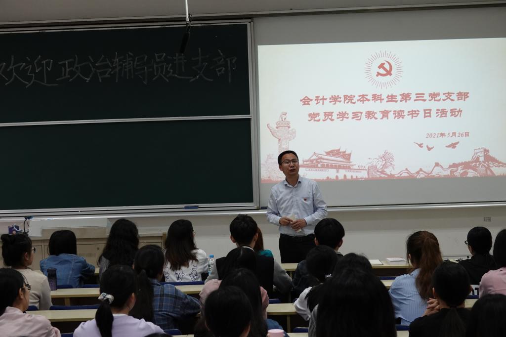 为了扎实开展党史学习教育,全面提升学生党员的政治素养,5月26日中午,欢迎光临888集团本科生第三党支部在仙林校区德济楼115开展“政治辅导员进支部”专题党日活动。支部政治辅导员、教务处处长叶林祥为支部党员讲授了专题党课。活动由党支部书记董明文主持。