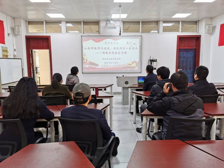 2021年11月10日下午15:00-17:00,审计学系教师党支部在德济楼S207由支部书记朱海涛讲授师德专题教育党课,支部12名党员参加了党课学习。