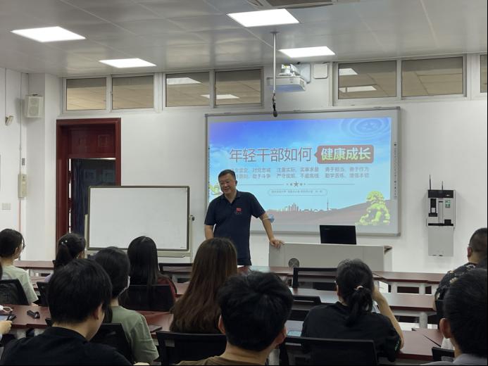 孙彬主任围绕“年轻干部如何健康成长”向学生党员做了专题讲座,鼓励年轻党员在学习生活中要体现党员的先锋模范作用,有责任能担当,以问题为导向,秉持着“想干事能干事”的行动方针,在未来的岗位发挥应有的作用。
