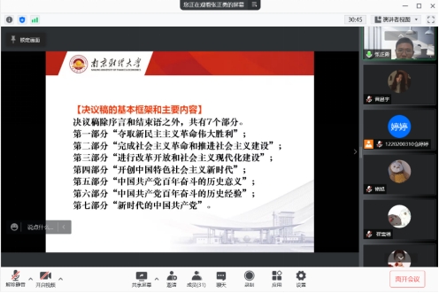 张正勇老师首先介绍了“党的十九届六中全会”举办情况及其重要历史意义,接着将党的三次重大历史决议进行了介绍,并重点分析了此次决议的起草过程,同时梳理了决议稿的基本框架和主要内容,为同学们理解决议内容和深入领会“党的十九届六中全会”精神打下良好基础。