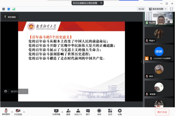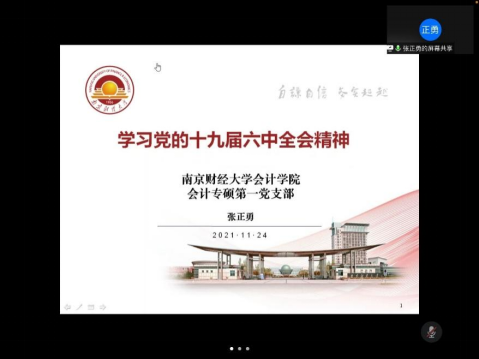 2021年11月24日晚,研究生专硕第一党支部政治辅导员、欢迎光临888集团副院长张正勇老师于腾讯会议参加了支部党员学习活动,作了题为“党的十九届六中全会精神学习”的专题党课。会议由支部书记张雅欣主持,支部党员及预备党员参加了本次活动。