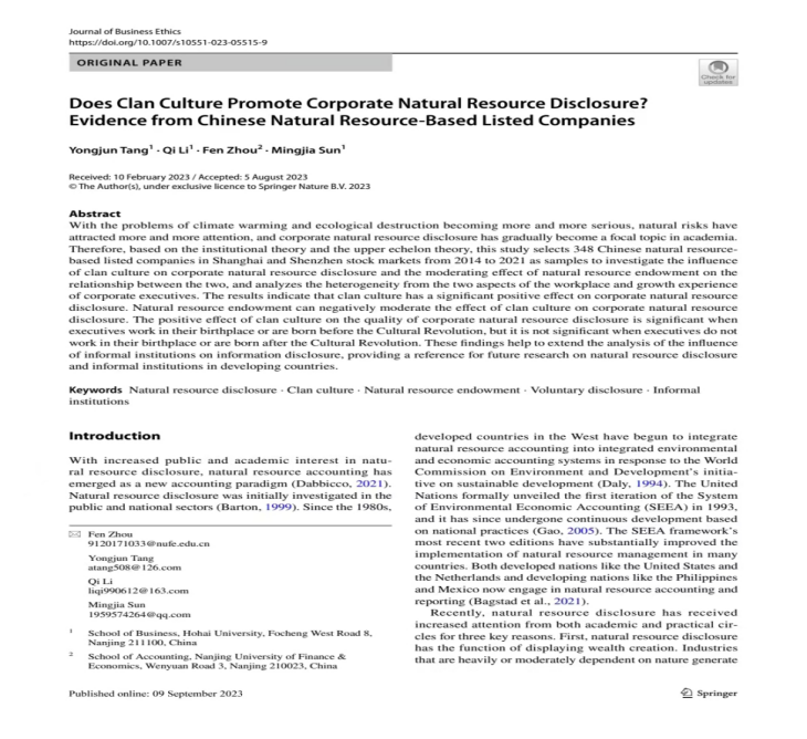 Yongjun Tang, Qi Li, Fen Zhou, Mingjia Sun. “Does Clan Culture Promote Corporate Natural Resource Disclosure:Evidence from Chinese Natural Resource-Based Listed Companies”,Journal of Business Ethics,2023-09-09(Oline) , https://doi.org/10.1007/s10551-023-05515-9.