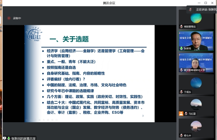2023年1月6日下午,对外经济贸易大学原副校长张新民教授以线上会议形式主讲“关于国家基金申报”的专题讲座,深入细致地介绍了国家社科基金项目申报的要点,本次讲座由欢迎光临888集团院长姚文韵教授主持,欢迎光临888集团广大教师参加了讲座。