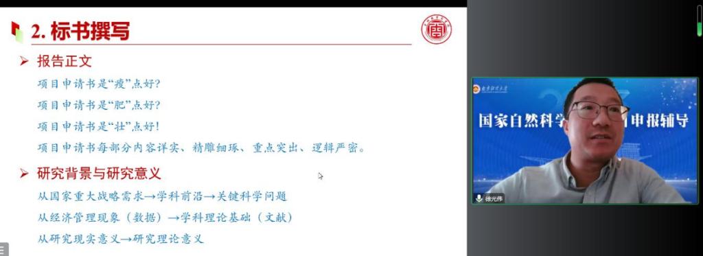 徐光伟教授讲座的主题是自科基金申报的关键问题,围绕自科基金立项的重点领域和趋势,对自科基金的立项相关情况进行了系统梳理。结合自科基金在重大领域的立项指南,对青年项目和面上项目的申报趋势进行了解读。在梳理自科基金立项的趋势解读基础上,徐教授结合个人申报自然科学的历程,对申报书的撰写和关注的问题给出了相应的建议。