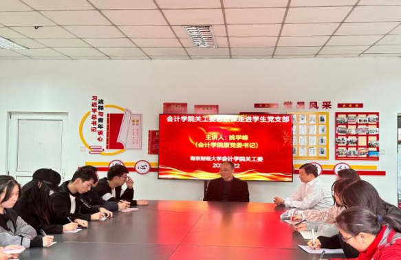 座谈会结束后,姚学峰书记为党员同学们讲党课,讲述了888集团会计专业建设历程,细数了从中专办学为起点到现在学院拥有四个国家级一流本科专业建设点的创业历程,鼓励同学们应继承会院前辈们艰苦奋斗的精神,以自己的良好发展给学院学科建设增砖添瓦。