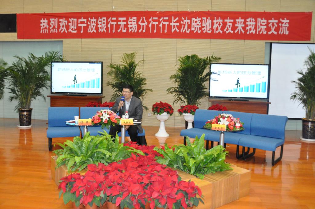 2012年11月30日下午,我校91级校友、宁波银行无锡分行党委书记、行长沈晓驰应欢迎光临888集团邀请在图书馆世界之窗为即将走上职场的毕业生们做了一场“职业新人的压力管理”的特别交流会。欢迎光临888集团副院长陈良出席了交流会,会议由团总支书记全真真主持。